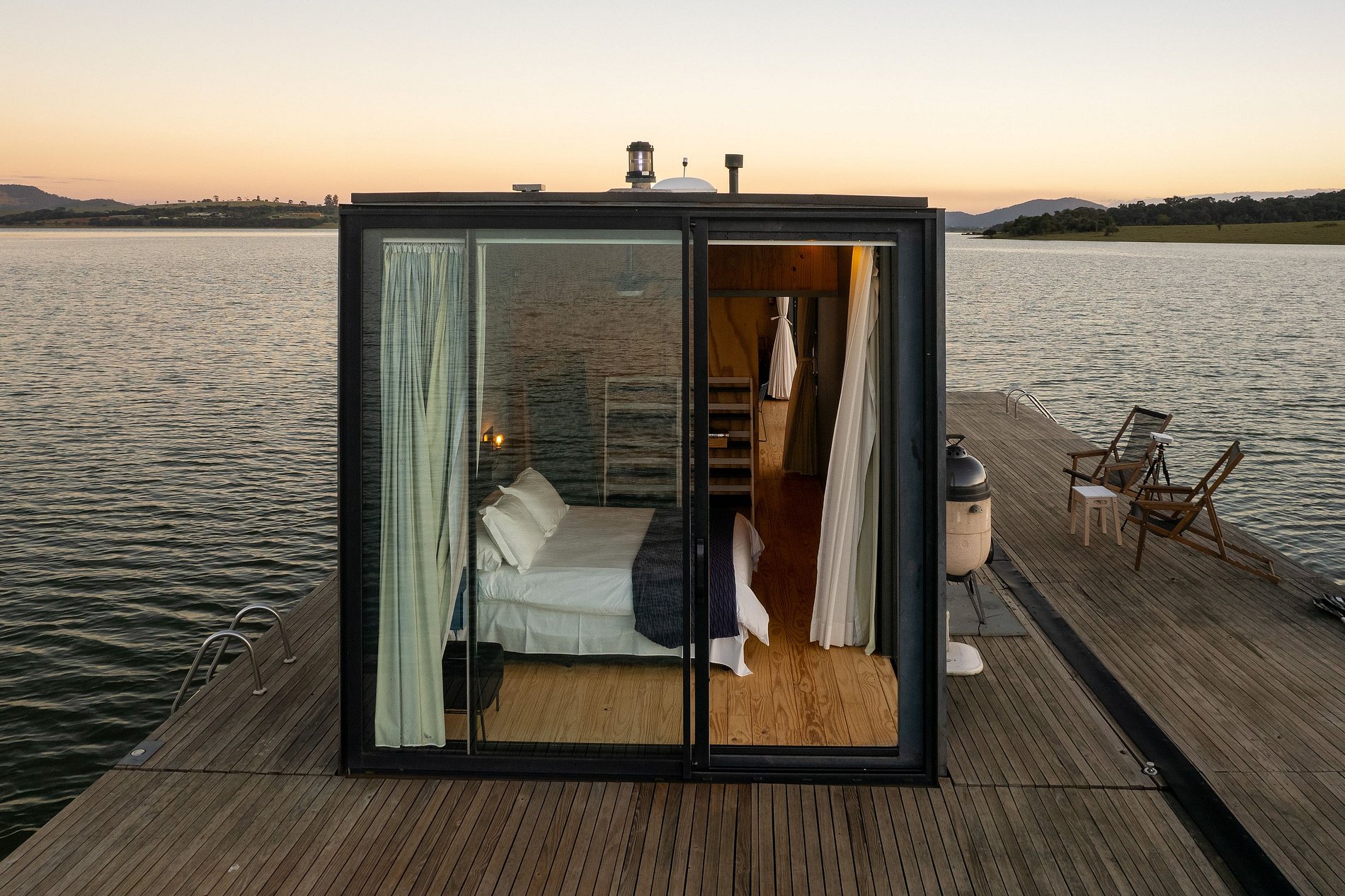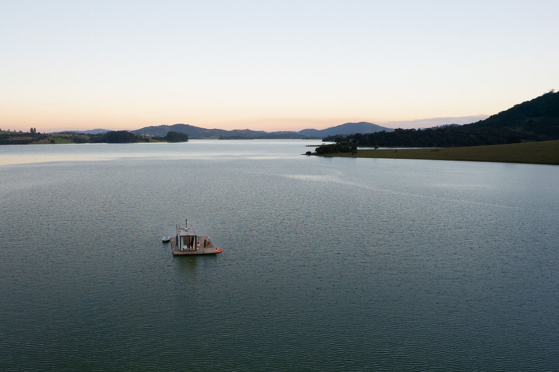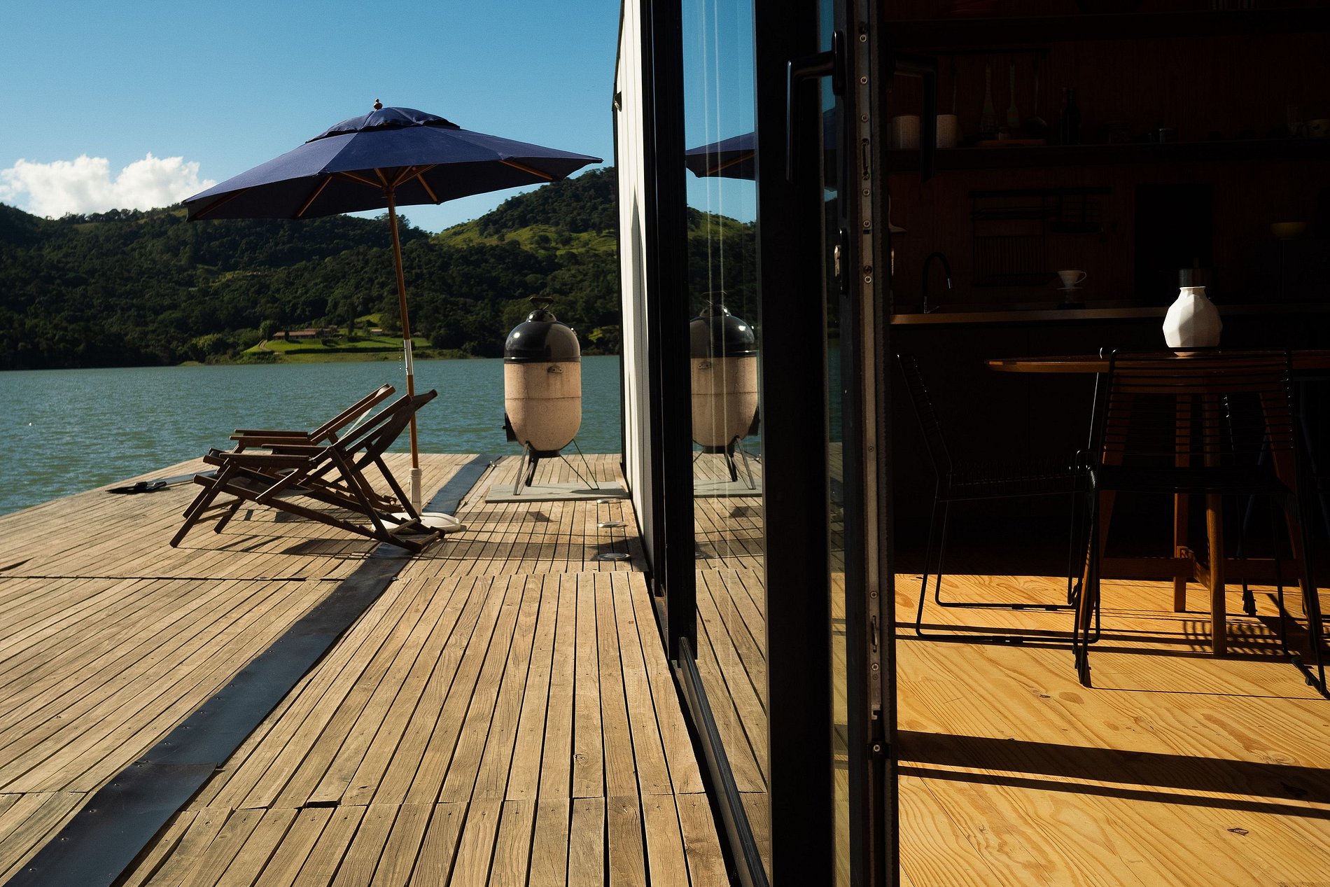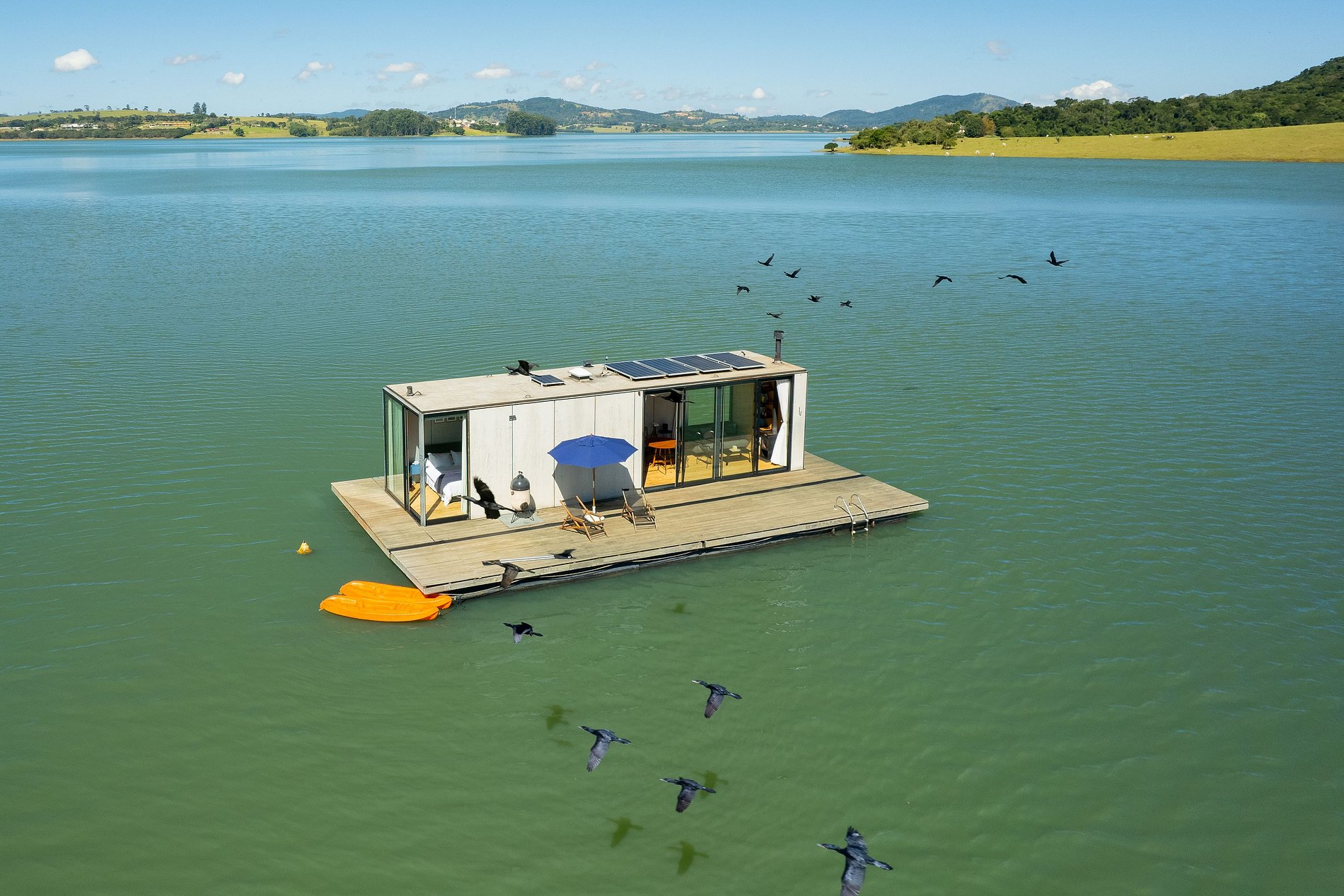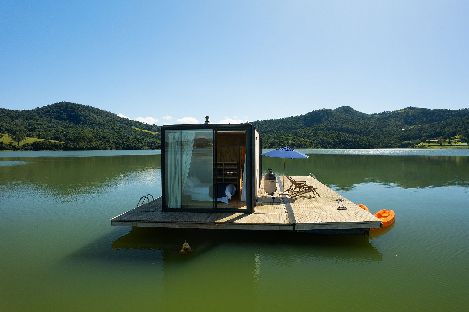 O flutuante #1 possui tudo que você precisa para desfrutar desse lugar incrível. Uma cozinha totalmente equipada permite que você prepare refeições com vista para a represa, enquanto que a cama queen garante uma confortável noite de sono. Na casa, você ainda pode desfrutar de uma sessão de cinema exclusiva com o projetor Nebula enquanto se aquece com